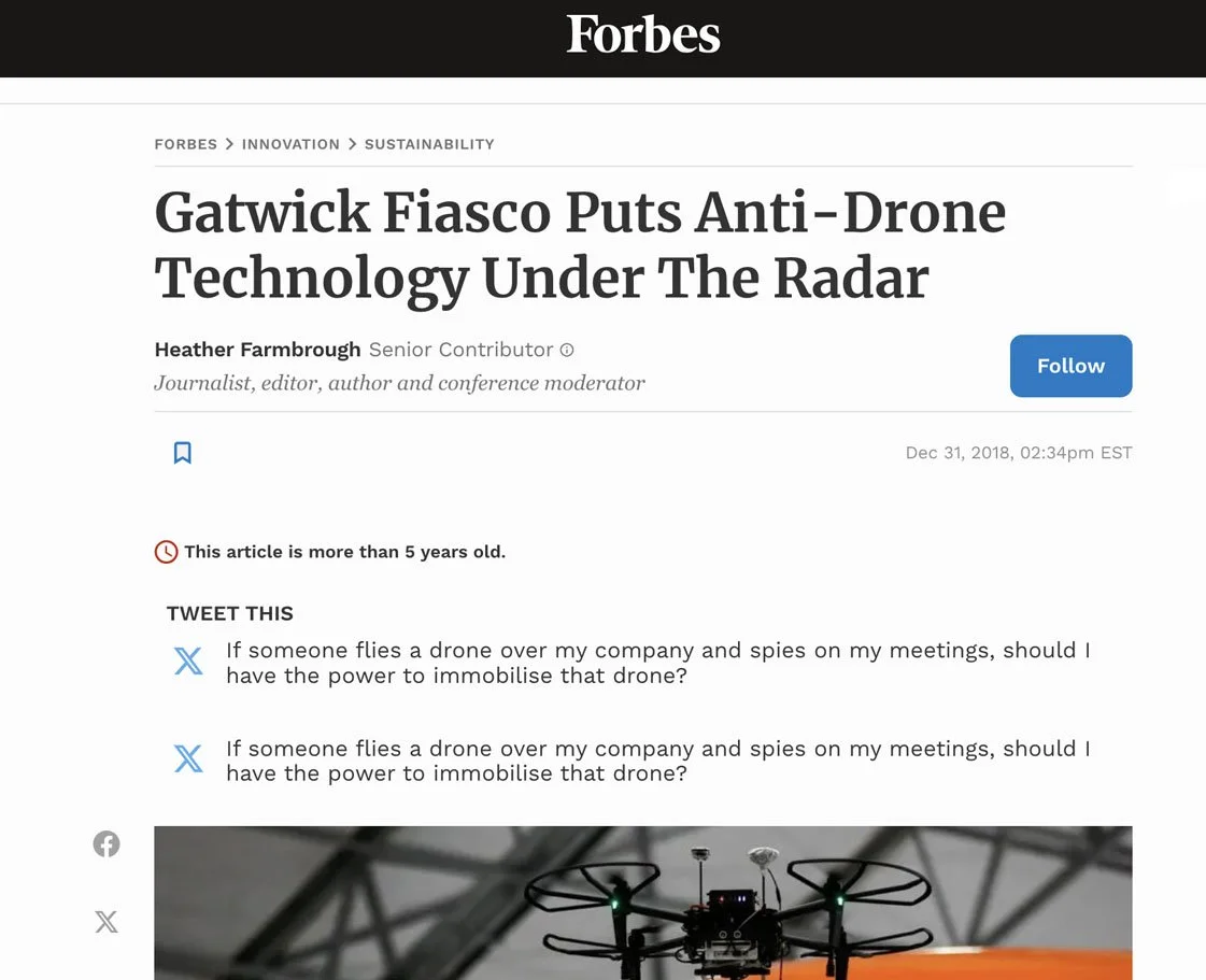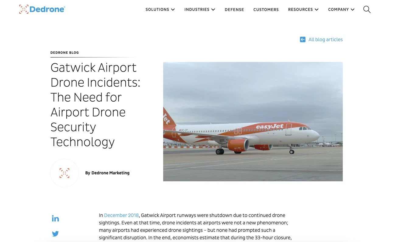 In December 2018, an unidentified drone in the Gatwick airport airspace, suspended all flights for nearly 30 hours. Dedrone was first to respond to discuss with business and avaiation reporters about the security implications of drones around critical infrastructure sites