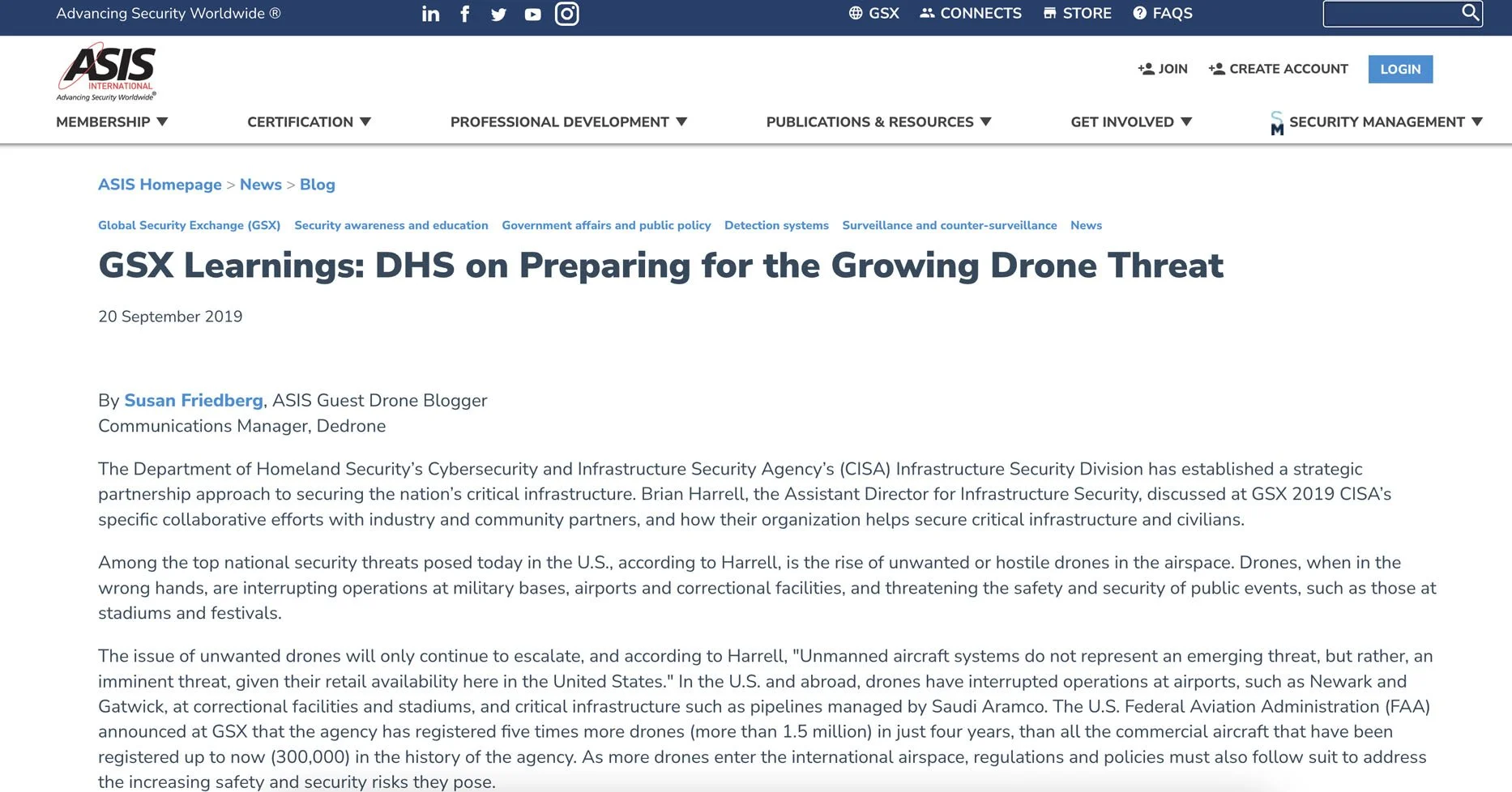 Dedrone was a featured attendee and speaker at the world’s largest and most influential security industry association. PR activities included securing event space, negotiating contracts, securing speakerships, coordinating interviews, and coordinating a product launch press release. Additionally, Susan secured a press pass and was a featured contributed writer for post-event media promotion.
